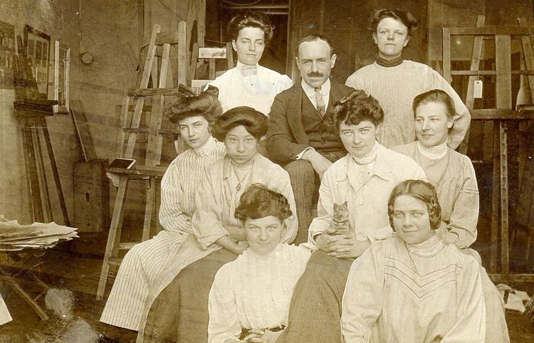 Adolf Höfer (1869-1927), der Maler und seine Studentinnen der Damenakademie München (um 1910), sw-Fotografie, Privatbesitz, als gemeinfrei gekennzeichnet, Details auf Wikimedia Commons