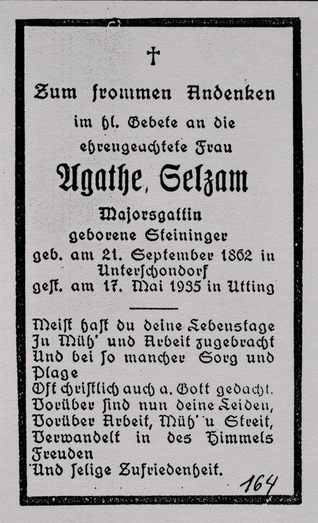 Während seines Aufenthalts beim Postwirt in Unterschondorf verliebt sich Eduard Selzam in die um drei Jahre jüngere Gastwirtstochter Agathe Steininger (geb. 21.09.1862, gest. 17.05.1935).