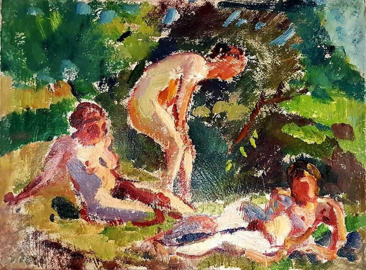 Ludwig Bock, Badende am See, o. J., Öl auf Malkarton, ca. 32 x 41 cm, Thoma Galerie Starnberg