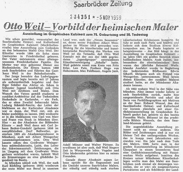In einem Artikel der Saarbrücker Zeitung vom 05.11.1959 ist unter der Überschrift „Otto Weil – Vorbild der heimischen Maler“ zum 75. Geburtstag des Malers Folgendes zu lesen: