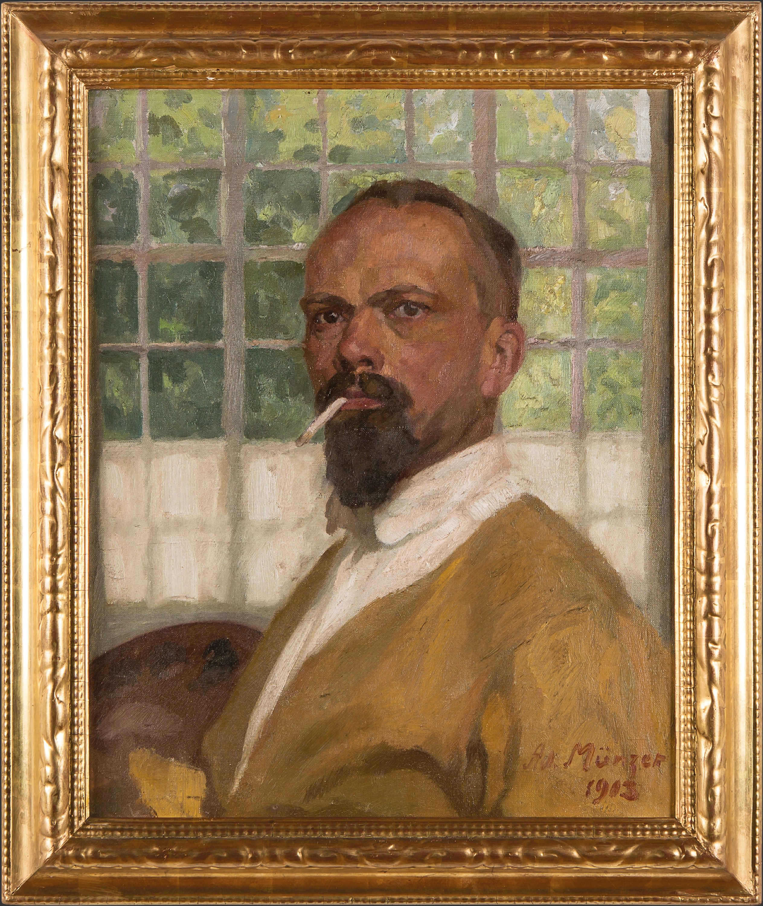 Adolf Münzer, Selbstbildnis, 1912, Öl auf Leinwand, 60 x 50 cm, PrivatbesitzIm Jahr 1913, in der Zeit seiner größten Erfolge, stellt sich Adolf Münzer im Alter von 43 Jahren selbst dar: als Maler mit einer Palette und einer Zigarette im Mundwinkel.Sein wacher, ernster Blick wendet sich aus dem Bild. Dabei scheint er jedoch weniger den Betrachter zu adressieren, vielmehr scheint es, als denke er über das eben entstehende Bild nach. Wie oft in Künstlerselbstporträts zeigt das Bild den sinnenden Blick des Künstlers in den Spiegel und verweist so auf die eigene Positionsbestimmung.Der Künstler steht vor einem großen Atelierfenster, das kleinteilig durch Sprossen unterteilt ist.Wie eine Art Horizontlinie verläuft ein Vorhang in der Horizontalen exakt auf Höhe des weißen Kragens seines Hemdes, das er unter dem Malerkittel trägt. Neben der Farbe Weiß und den Grünvaleurs des Laubes im Garten außerhalb des Ateliers sind im Bild nur noch Grau und der goldbraune Ton von Inkarnat und Kleidung zu finden. In lockerer Malweise stellt sich Münzer im Dreiviertelprofil, als Brustbild stehend, ohne die ausführenden Hände, den Kopf leicht aus der Mittelachse nach rechts gerückt, dar.Der Künstler nimmt zusammen mit der Palette die gesamte Bildbreite ein. Sein rechter Oberarm wird leicht vom Bildrand überschnitten. Münzer zeigt sich durchaus selbstbewusst, als reflektierender kreativer Geist, wofür auch die Signatur A. Münzer 1912 in großen Lettern in der unteren rechten Bildecke spricht.Das Selbstporträt wirkt insgesamt kraftvoll, fast wuchtig und ist von konzentrierter Ruhe geprägt.Teilen