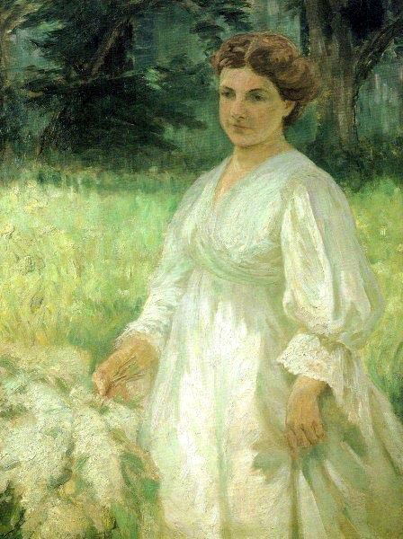 Franz Wilhelm Voigt, Der Fliederstrauß, um 1906, Öl auf Leinwand, 131 x 100 cm, © Kunstsammlung der Stadt Hof, Privatsammlung Wolfgang und Sabine RügerAm 30.03.1904 heiratete Franz Wilhelm Voigt nach sechsjähriger Verlobungszeit seine Frau Barbara, geb. Wolf (1873-1949).Die Trauung fand nur standesamtlich statt. In einem Brief an seinen älteren Bruder Hugo erwähnt Franz Wilhelm Voigt ein Jahr vor der Heirat:„Tante M. [Voigts Pflegemutter Marie] schrieb mir zum ersten Male eine ernstliche Ermahnung zum heirathen! Habt ihr mit Tante über mich gesprochen? Hat Tante vielleicht auf dem Bilde mein Porträt mit Betti entdeckt?“ (Brief vom 31. Januar 1903)Offenbar hatte die junge Frau Voigt schon mehrfach Model gestanden. Zwei Jahre nach der Hochzeit entstand das Gemälde „Der Fliederstrauß“. Barbara Voigt steht in einem fließenden, weißen Kleid mit V-Ausschnitt und bauschigen Ärmeln inmitten des saftigen, hohen Grases. In der rechten Hand hält sie einen weißen Fliederstrauß. Voigt malt Betti als Dreiviertelfigur, ihre Gestalt ist etwa auf Kniehöhe vom Bildrand überschnitten. Sie steht in der rechten Bildhälfte und ist ins Dreiviertelprofil gedreht. Es scheint, als gehe sie auf den Maler zu.Der Flieder und das hohe frischgrüne Gras lassen vermuten, dass das Bild im Mai entstanden ist.Das Gemälde ist annähernd monochrom, aus Weiß- und frühlingshaften Grünvaleurs aufgebaut. Voigt zeigt sich hier ganz in der Tradition des französischen Impressionismus. Eine große Rolle spielt die Reflexion der Umgebung auf dem weißen Kleid. Das obere Drittel des Bildes ist deutlich dunkler. Das leicht verschattete Gesicht der Dargestellten wird von Bäumen hinterfangen.Nicht selten hat der Maler seine Motive mehrmals variiert. Zu diesem Gemälde existiert eine zweite Version, bei der die junge Frau von einem Baumstamm flankiert ist. Fritz von Ostini schreibt in seiner Rezension zur „Scholle” in der Jahresausstellung im Münchener Glaspalast zu diesem Bild: „[...] eine Probe starken Fortschritts des Künstlers zu frischer farbiger Darstellung heißen, ebenso wie das sympathische Bildnis der jungen, weißgekleideten Frau mit dem Fliederstrauß im Garten“ (Ostini, S. 516).LITERATURKat. Ausst. Leo Putz, Max Feldbauer und der Kreis der „Scholle“ und „Jugend“ in Dachau um 1900, Dachau 1989, Abb. Kat.Nr. 30.Kat. Ausst. Leo Putz, 1869-1940: Gedächtnisausstellung zum 40. Todestag, Bozen 1980.Mey, Ellen: Der Maler Franz Wilhelm Voigt und die Künstlervereinigung „Scholle“, 69. Bericht des Nordoberfänkischen Vereins für Natur-, Geschichts- und Landeskunde, Hof 2017, S. 17, 36.Ostini, Fritz von: Die „Scholle“ im Münchener Glaspalast 1906, in: Die Kunst für Alle, Malerei, Plastik, Graphik, Architektur 21 (1906), Nr. 22, S. 505-516.Stadtarchiv München, PMB F211, Polizeimeldebogen, Franz Wilhelm Voigt und Barbara Voigt, geb. Wolf.Wendebourg, Eva-Andrea: Franz Wilhelm Voigt (1867-1949), Ein Maler der „Scholle”, Regensburg 2015.Teilen
