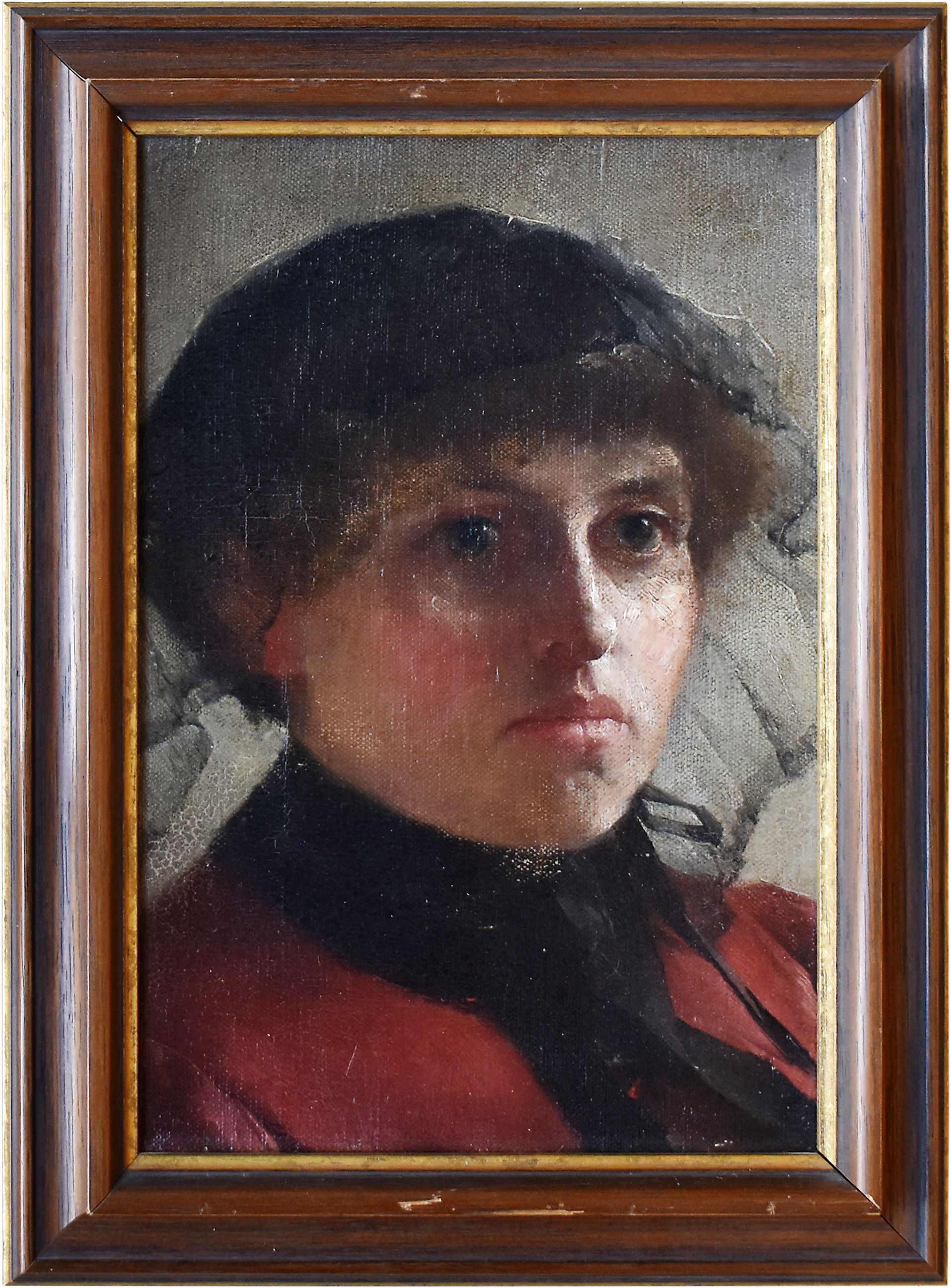 Eduard Selzam, Portrait seiner Gattin Agathe, geb. Steininger, o. J., Öl auf Leinwand, 32 x 22,5 cm, Privatbesitz, © Angelika HoegerlFür das kleinformatige Bildnis seiner Frau Agathe wählte Eduard Selzam einen engen Bildausschnitt. In der Art einer Büste zeigt er ihr Gesicht im Dreiviertelprofil und ihre Schultern vor einem unbestimmten beigefarbenen Hintergrund.Die junge Frau hat eine frische Gesichtsfarbe und leicht gerötete Wangen. Ihr Bildnis erscheint lebenswahr und nicht idealisiert. Der Blick geht am Betrachter vorbei und scheint auf etwas ihr Gegenüberstehendes gerichtet. Mit Ausnahme des Hauttons und des Hintergrunds bestimmt der Akkord von Rot und Schwarz das Gemälde.Sie trägt ein hochgeschlossenes Kleid mit dunklem Kragen und eine Haube mit einem kurzen hauchzarten Schleier, der ihre Physiognomie rahmt.Teilen