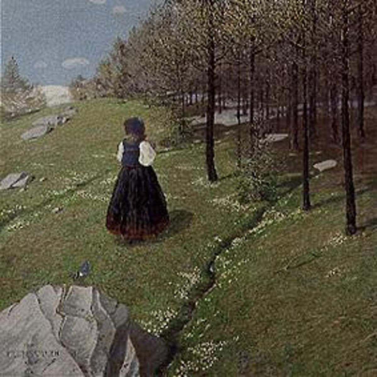 Erich Erler malte das Bild „Vorfrühling“ 1901, in dem Jahr, als er erstmals als Mitglied der Künstlergruppe „Scholle“ in München ausstellte. Das Gemälde in ungewöhnlichem, annähernd quadratischem Format präsentiert sich in Mischtechnik auf Leinwand. Interessant ist die Komposition, die deutlich durch Diagonale geprägt ist. Da sind zunächst zwei schmale Rinnsale, die von der linken Bildkante bzw. vom unteren Bildrand nach rechts oben, in die Tiefe der Landschaft führen. Gegenläufig erscheint eine zweite diagonale Kompositionslinie, die Baumreihe, die vom rechten Rand nach links in den Hintergrund verläuft. Erler schafft so eine beachtliche Raumtiefe. An der linken unteren Bildecke, also unmittelbar im Vordergrund, hebt sich ein massiver Stein ab, auf dem der Künstler auch signiert hat. Im Mittelgrund, links unterhalb der Bildmitte, ist eine junge Frau oder ein Mädchen in Tracht dargestellt. Erler wählt hier eine Rückenfigur. Der Blick des Betrachters folgt ihr in die Tiefe des Bildes und er wird förmlich mit in die Landschaft gezogen. Die Farbigkeit ist verhalten, wie es der Jahreszeit des Vorfrühlings angemessen ist. Die Luft erscheint noch kalt und klar, aber das Mädchen geht bereits ohne Mantel ins Freie. Ein zarter Schimmer von frühlingshaftem Grün ist schon zu erahnen. Lediglich im Schatten unter den Bäumen haben sich noch letzte Reste von Schnee erhalten. Erler präsentierte das Gemälde 1902 auf der Jahresausstellung im Glaspalast. Dort wurde es vom Bayerischen Staat für die Pinakothek erworben. Heute ist es Teil der Bayerischen Staatsgemäldesammlung und wird unter der Inventarnummer 8246 zusammen mit zwei weiteren Landschaften aus der Zeit um 1900 und dem Ölgemälde „Morgenrot (Soldatenbegräbnis)“ von 1916 im Magazin der Neuen Pinakothek aufbewahrt. LITERATURHabich, Georg: Die Jahres-Ausstellung im Münchener Glaspalast. In: Die Kunst, Monatshefte für freie und angewandte Kunst, Bd. V, München 1902, S. 515.Kat. Ausst. Offizieller Katalog der Münchener Jahres-Ausstellung 1902 im Kgl. Glaspalast, 2. Aufl., München 1902, S. 37 (lfd. Nr. 285, Öl- und Temperagemälde) Nebel, Monika: Erich Erler und seine Zeit bei der Künstlervereinigung „Scholle“. In: Neunzert, Hartfrid (Hrsg.): Erich Erler - ein Schollemaler, 1870 - 1946. Kunstgeschichtliches aus Landsberg am Lech, Schriftenreihe des Landsberger Stadtmuseums, Nr. 26, o.O. 2002, S. 10.