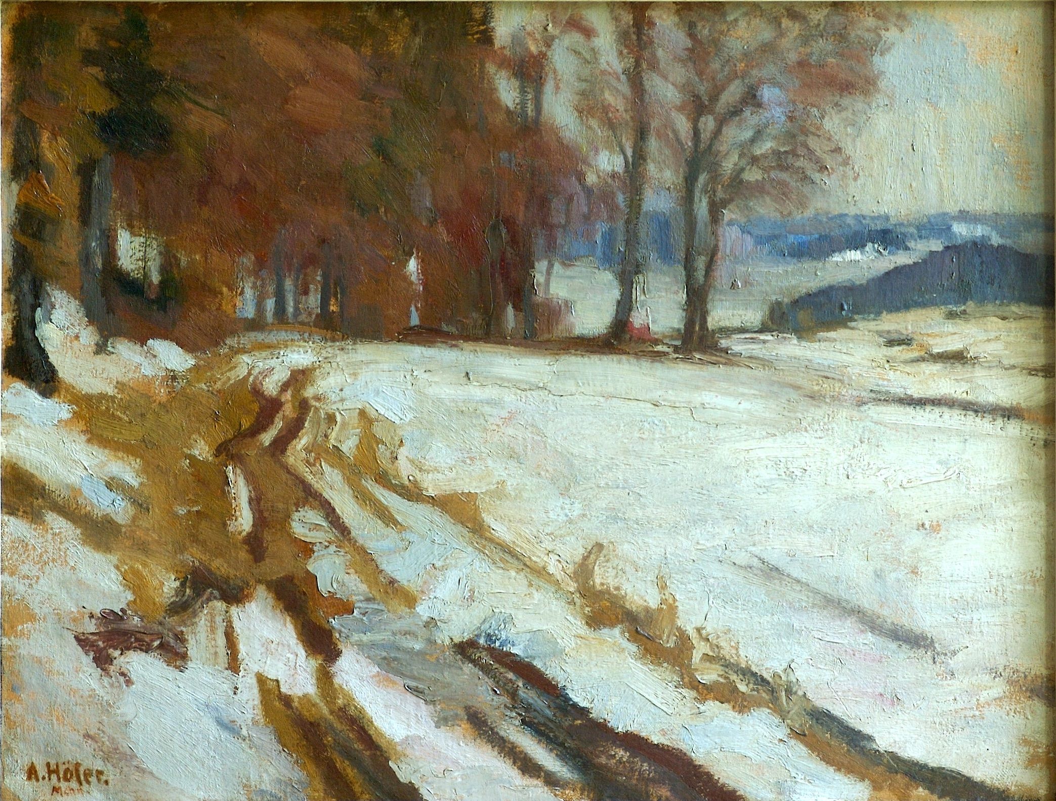 Adolf Höfer, Winterlandschaft III, o. J., Öl auf Leinwand, 50 x 65 cm, PrivatbesitzIm Zuge des Realismus und der Plein Air Malerei geriet das Thema der Jahreszeiten erneut in den Fokus der Maler und entwickelte sich zu einem autonomen Sujet. Die Jahreszeitenmotive zu Beginn des 20. Jahrhunderts stehen natürlich nicht mehr in der Tradition der „Monatsbilder“ am Beginn der Neuzeit. Sie sind auch keine Vanitassymbole oder Allegorien auf Leben und Vergehen, wie in der niederländischen Landschaftsmalerei des Barock, sondern zeigen als real beobachteter Zustand die Natur und besondere Lichtstimmungen.Besonders schneebedeckte Felder und das Variieren der Weißtöne bzw. das Spiel von Licht und Schatten auf einer Schneefläche üben eine besondere Faszination aus. Ähnlich wie der weiße Stoff eines Kleides oder eines Tischtuchs unter Bäumen spiegelt der Schnee die farbigen Reflexe der Umgebung.Höfer steht mit diesen Motiven in einer Traditionslinie, die von den französischen Impressionisten wie Monet, Camille Pissarro oder Alfred Sisley über den deutschen Maler Max Liebermann bis hin zu den „Scholle“-Kollegen Gustav Bechler oder Erich Erler-Samaden reicht.Der Weg, der in einem leichten Bogen vom unteren Bildrand zu einer Baumgruppe am rechten oberen Bildbereich führt, begrenzt das weiße Feld auf der rechten Bildseite. Hier ist der Schnee schon etwas angetaut und bräunlichem Matsch gewichen.Die Bäume im Mittelgrund trennen Vorder- und Hintergrund ab und verstellen teils den Blick auf die blauen Berge in der Ferne.Höfers Malweise ist pastos, sein Pinselstrich ist im vorderen Bildteil breiter, was das Spiel mit Ferne und Nähe betont.Text: Regina M. FischerLITERATURGerheuser, Frohmut: Adolf Höfer (1869-1927), Gemälde, Nachtrag zum Katalog von 2011, in: Höfersche Familienschriften, 5 (2020), S. 24.Teilen